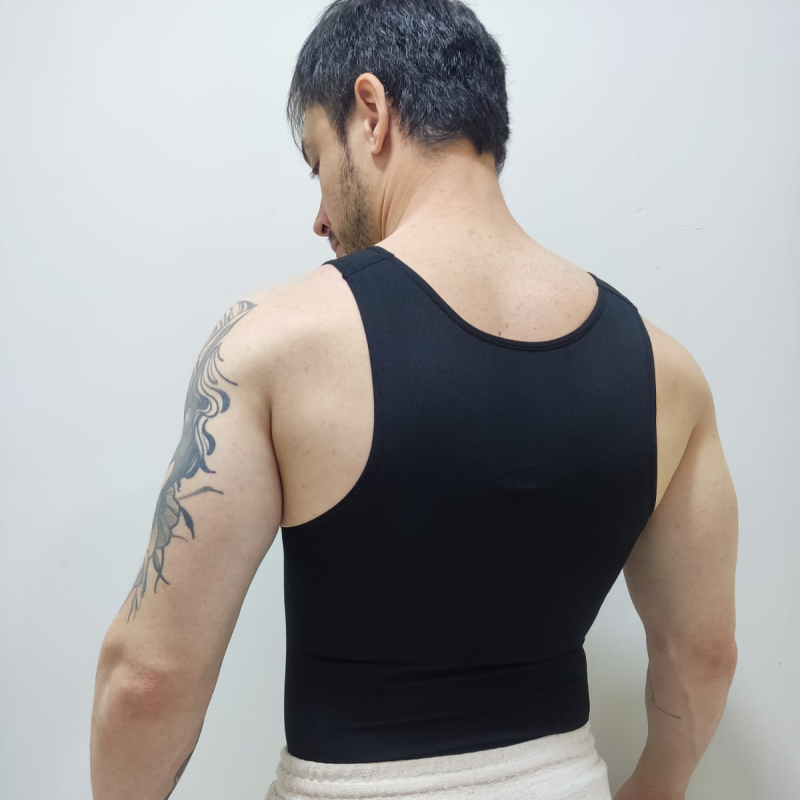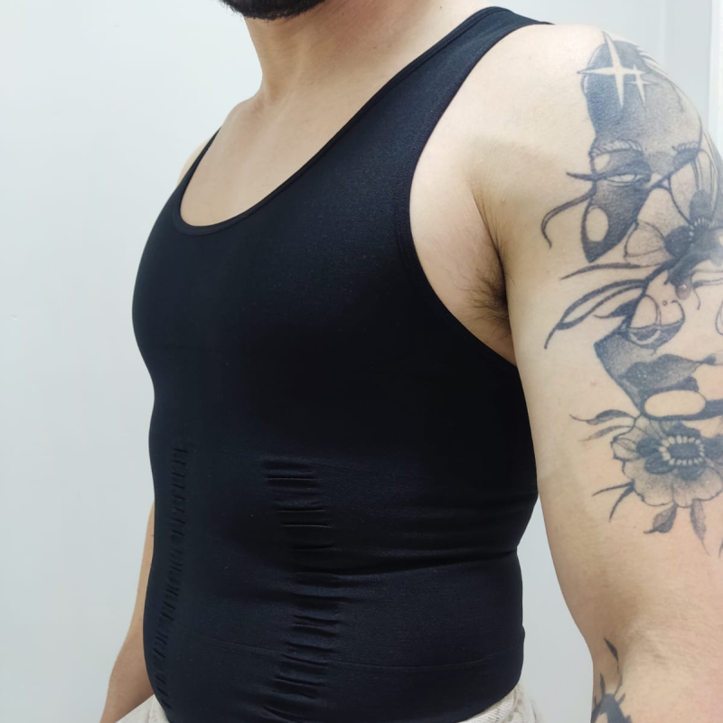 Com design discreto e tecido de alta compressão, ela ajuda a reduzir a aparência da ginecomastia, barriga saliente e flacidez abdominal, proporcionando um visual mais definido instantaneamente.